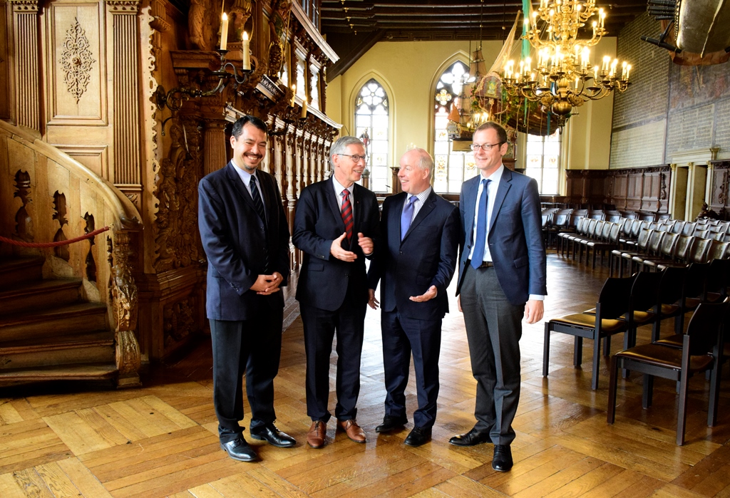 US-Generalkonsul Richard Yoneoka, Bürgermeister Dr. Carsten Sieling, US-Gesandter Kent Logsdon und Wirtschaftssenator Martin Günthner in der Oberen Rathaushalle