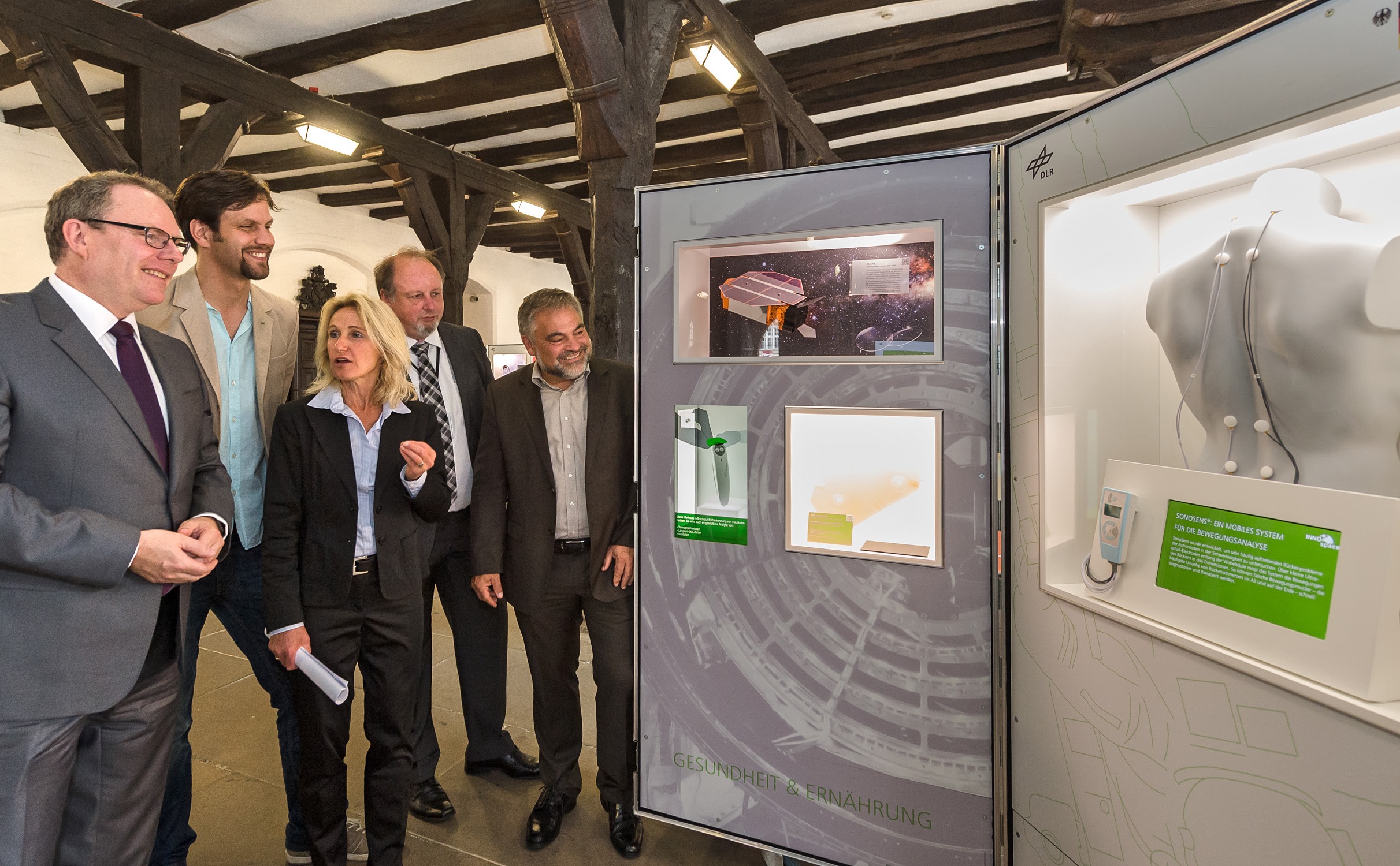 v.l.n.r.: Staatsrat Ekkehart Siering (Senator für Wirtschaft, Arbeit und Häfen) ließ sich von Dr. Dirk Stiefs (DLR_School_Lab), Dr. Franziska Zeitler (Deutsches Zentrum für Luft- und Raumfahrt), Götz Anspach von Broecker (Airbus) und Hans-Georg Tschupke (WFB) zum Auftakt der Ausstellung informieren. Auch Bremer Unternehmen und Institute sind dabei mit Exponaten und Projekten vertreten.