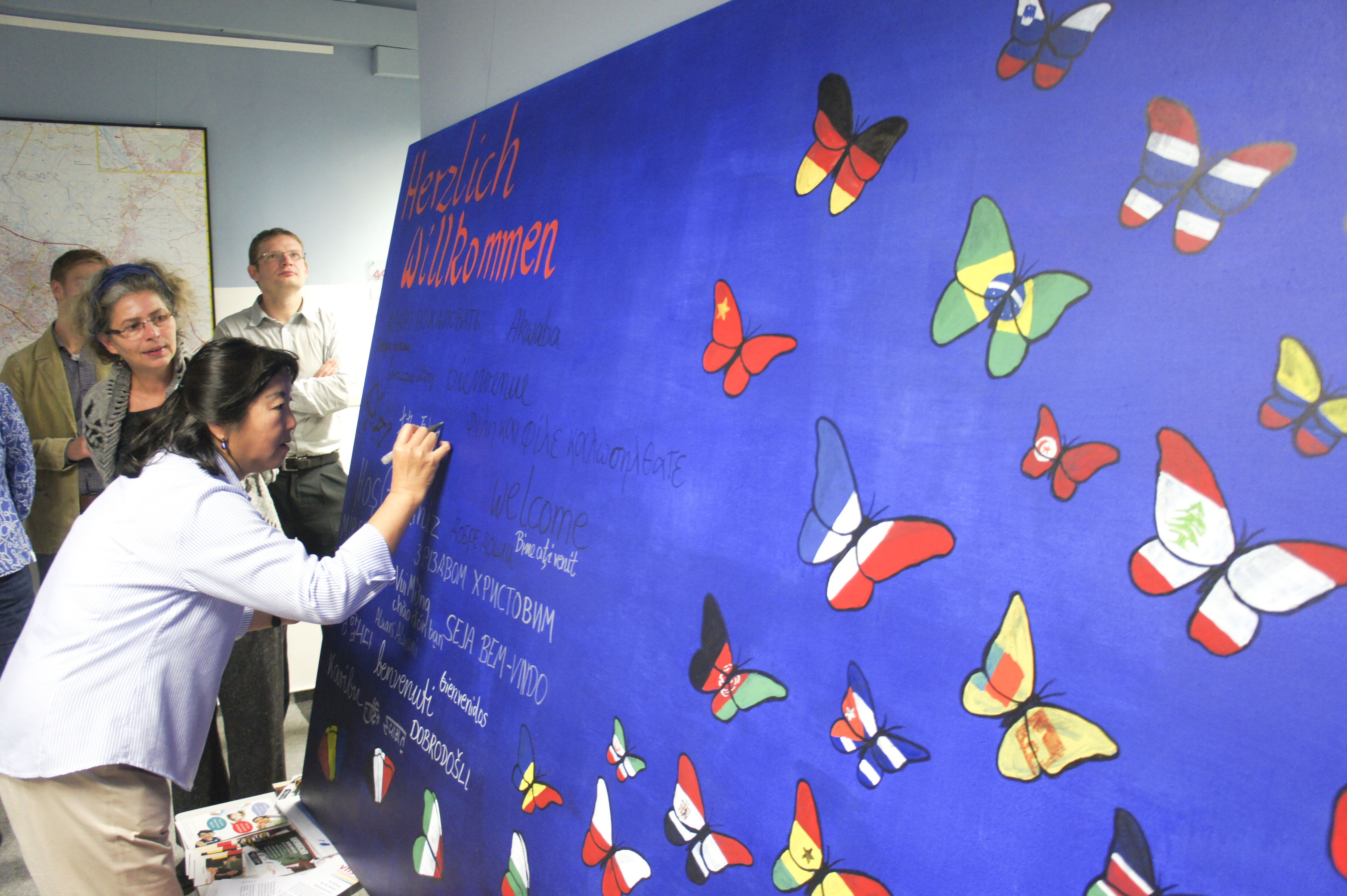 VHS-Dozentin Rong Fang Cao bringt chinesische Schriftzeichen auf dem Bild von Sonja Schadwinkel (dahinter stehend) an.