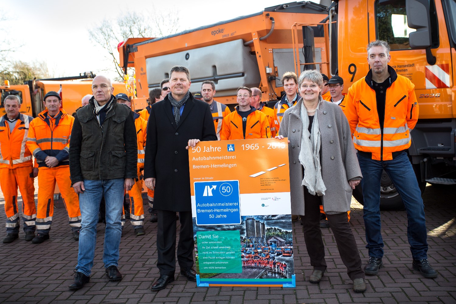 vlnr.: Holger Horstmann, Abteilungsleiter Straßenerhaltung im Amt für Straßen und Verkehr, Senator Dr. Joachim Lohse, Brigitte Pieper, Leiterin des Amtes für Straßen und Verkehr, und Michael Haas, Leiter der Autobahnmeisterei Bremen