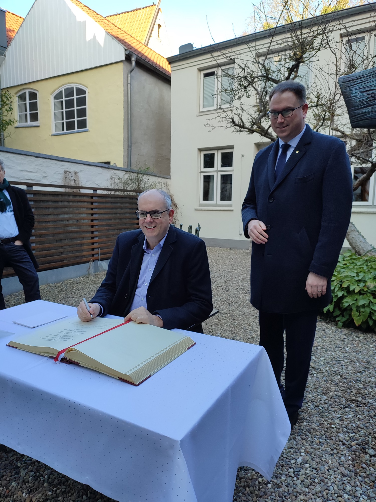 Zwei Bürgermeister, ein Goldenes Buch: Dr. Andreas Bovenschulte (links) trägt sich unter den Augen seines Lübecker Kollegen Jan Lindenau in das Goldene Buch der Hansestadt Lübeck ein. Foto: Hansestadt Lübeck