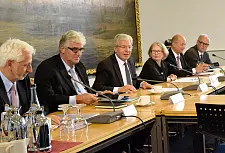 BU1: Prof. Dr. Konrad Elmshäuser, Leiter des Staatsarchivs, Hermann Kleen, Sprecher des Senats, Bürgermeister Jens Böhrnsen, Kornelia Buhr, Leiterin der Rathausverwaltung, Landesdenkmalpfleger Prof. Dr. Georg Skalecki und Klaus Sondergeld, Geschäftsführer in der Wirtschaftsförderung Bremen für den Bereich Standortmarketing (v.l.) bei der Pressekonferenz.