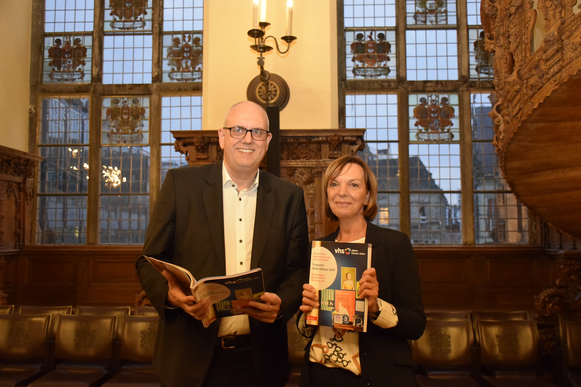 Foto-Download (jpg, 666.4 KB) 280 Seiten geballtes Wissen für Bremen - Bürgermeister Bovenschulte und Direktorin Schoefer mit dem aktuellen VHS-Programm