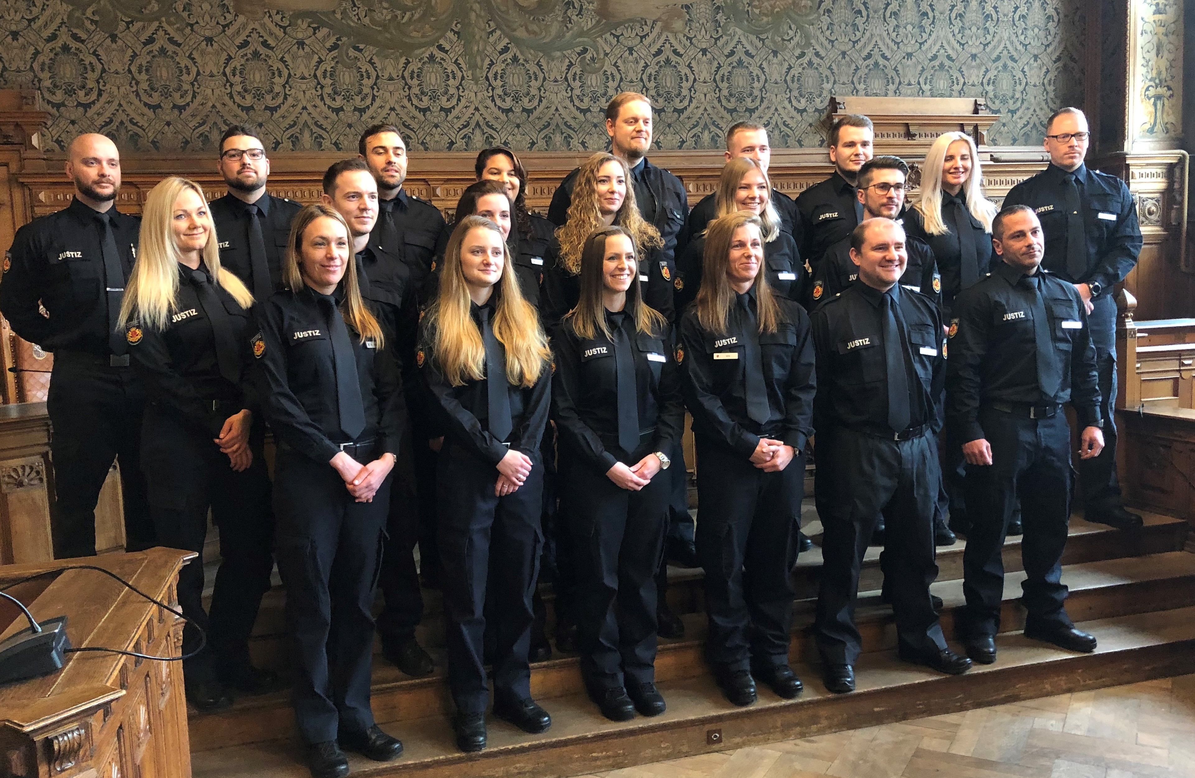 21 von anfangs 24 Anwärterinnen und Anwärtern des Ausbildungsjahrgangs 2018 haben es am Ende geschafft: Ihnen wurden heute im Schwurgerichtssaal des Landgerichts offiziell ihre Ernennungsurkunden durch Justizstaatrat Björn Tschöpe überreicht. „Sie haben durchgehalten, Sie haben es geschafft – ein echter Grund zur Freude. Für Sie aber auch für mich und uns alle: Denn als Vollzugsbeamte werden Sie in Bremen nicht nur dringend gebraucht, sondern Sie haben sich entschieden, in einem Bereich zu arbeiten, der letztlich das Rückgrat unseres Rechtsstaats und damit auch unserer Demokratie bildet. Dafür bedanke ich mich sehr!“, so Tschöpe.