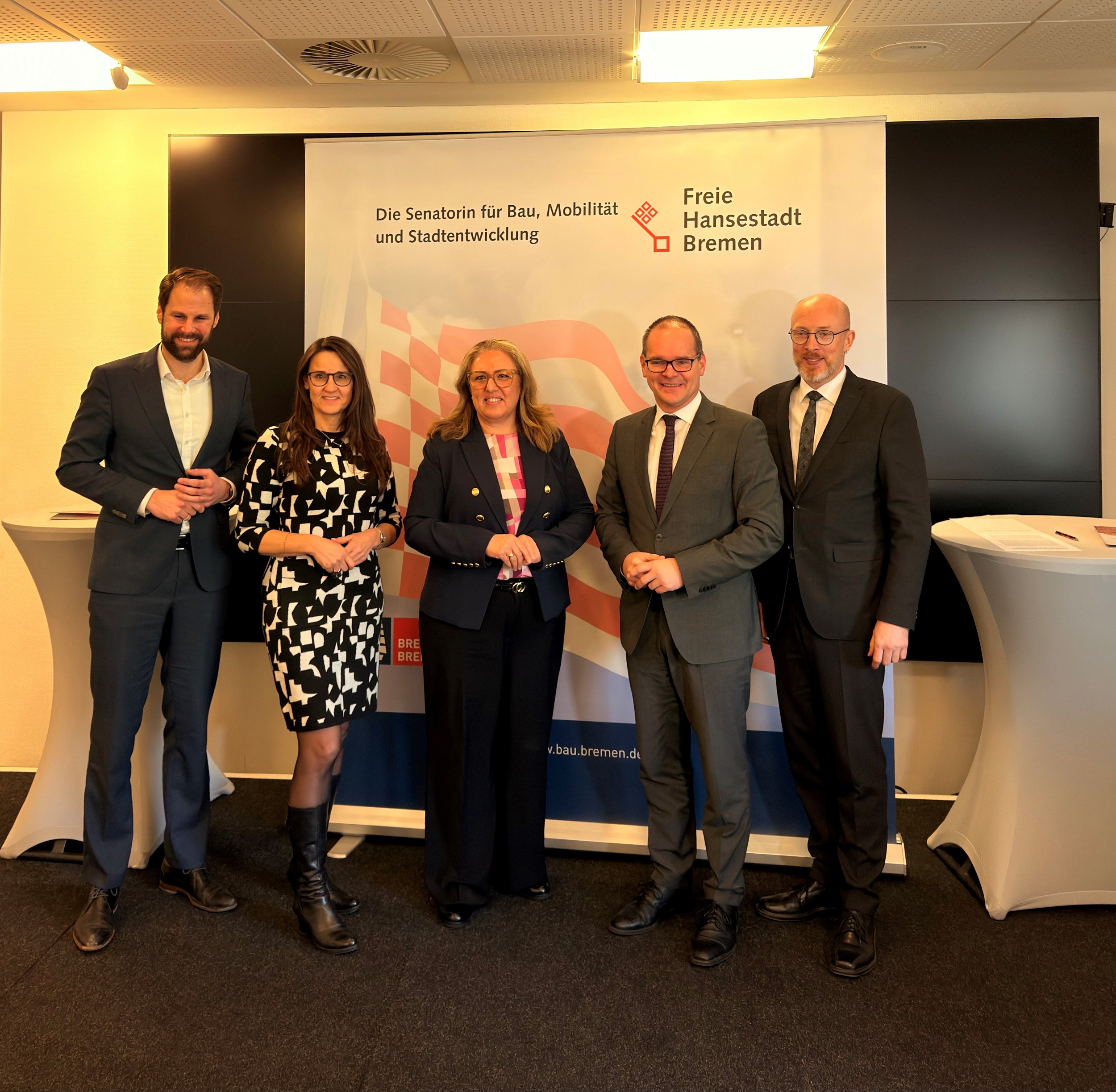 Beschlossen eine Erklärung zur Beschleunigung des Wohnungsbaus während des 3. Wohngipfels in Bremen (von links): Dr. Frederik Hogrefe (zuständiger Innenstaatssekretär Schleswig-Holsteins für das Bauen), Karen Pein (Senatorin für Stadtentwicklung und Wohnen der Freien und Hansestadt Hamburg), Bremens Bausenatorin Özlem Ünsal, Grant Hendrik Tonne (Niedersachsens Wirtschafts- und Bauminister), Christian Pegel (Minister für Inneres und Bau Mecklenburg-Vorpommern). Foto: Bauressort