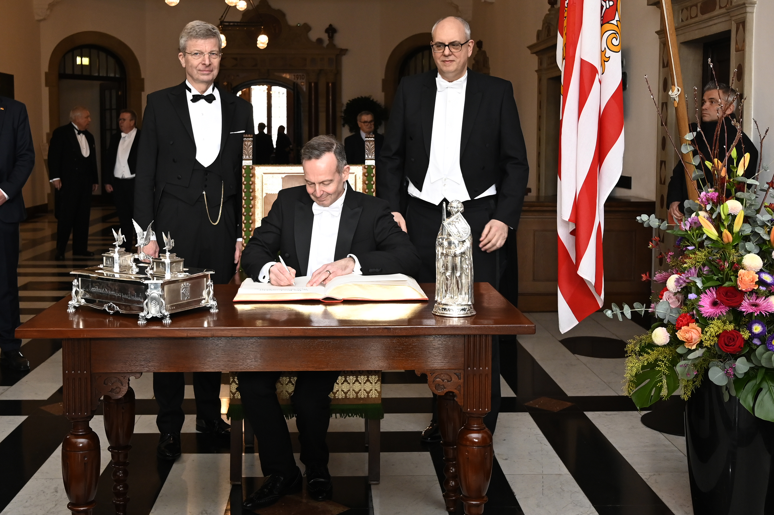 Vor dem Essen in der Oberen Rathaushalle begrüßte Bürgermeister Dr. Andreas Bovenschulte den Ehrengast der Schaffermahlzeit, Dr. Volker Wissing, Bundesminister für Digitales und Verkehr. Wissing trug sich in das Goldene Buch der Freien Hansestadt Bremen ein. Der Bürgermeister nimmt als Hausherr des Rathauses an der Traditionsveranstaltung teil. Gast des Bürgermeisters ist Sigrid Nikutta, Vorstand Güterverkehr Deutsche Bahn und Vorstandsvorsitzende DB Cargo AG.