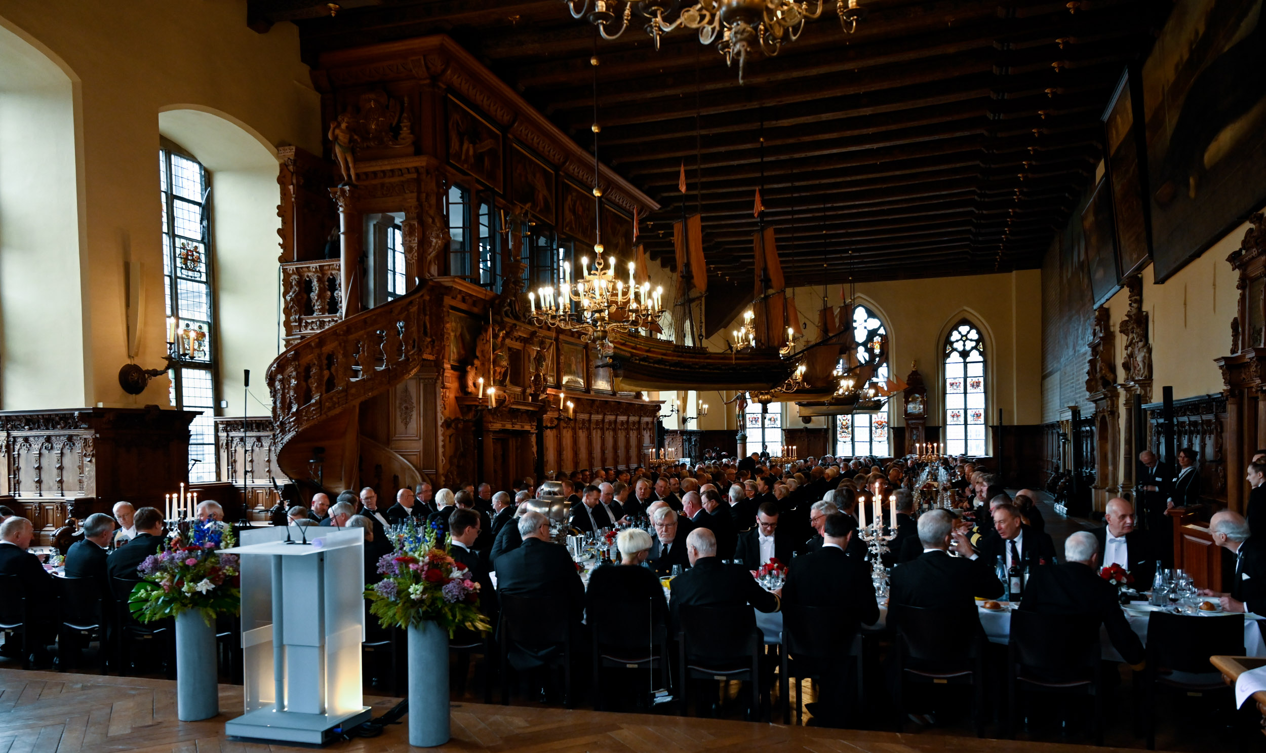 Im Anschluss an den Eintrag nahmen die Schaffer und Schafferinnen, Seeleute und Gäste an der großen Tafel – aufgebaut in Form des Dreizacks des Meeresgottes Neptun – in der Oberen Halle Platz. Für die rund 100 Gäste ist es ein einmaliges Erlebnis, da für sie eine Teilnahme nur einmal im Leben möglich ist.