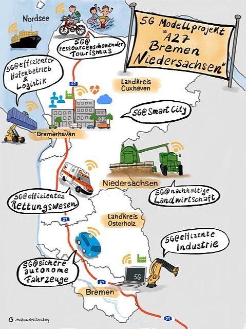 Das vorgeschlagene 5G-Modellprojekt A27 Bremen-Niedersachsen umfasst die Konzeptionierung für den Aufbau und die Evaluation verschiedener Anwendungen und Technologien in ausgewählten Ausbauschwerpunkten entlang der Regionen der Autobahn A27.