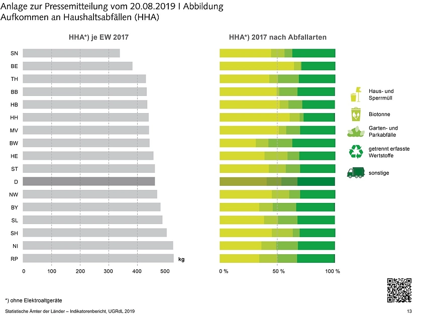 Das Thema Abfall ist nur ein Kapitel in dem aktuellen Länderbericht zum Umweltstatus. Darin werden statistische Informationen zur Umwelt und Nachhaltigkeit im Ländervergleich anhand umweltrelevanter Indikatoren anschaulich dargestellt. Außerdem zeigt eine Trendanalyse ausgewählter Umweltindikatoren die zeitliche Entwicklung in den Ländern an.