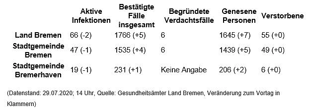 Bei neun der stationär behandelten Personen handelt es sich um Bürgerinnen und Bürger aus dem Land Bremen. Zwei von ihnen müssen auf Intensivstationen behandelt werden, sie werden nicht beatmet. Bei mindestens fünf Bremerinnen oder Bremern muss der Gesundheitszustand als schlecht oder kritisch beschrieben werden.