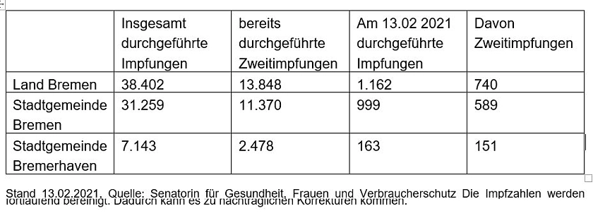 Im Land Bremen wurden bislang insgesamt 24.554 Personen geimpft. 13.848 davon haben bereits eine zweite Impfung erhalten. 19.889 der geimpften Personen entfallen auf die Stadtgemeinde Bremen, hier haben bislang 11.370 Personen eine zweite Impfung erhalten. In Bremerhaven wurden 4.665 Personen geimpft, 2.478 davon bereits zwei Mal.