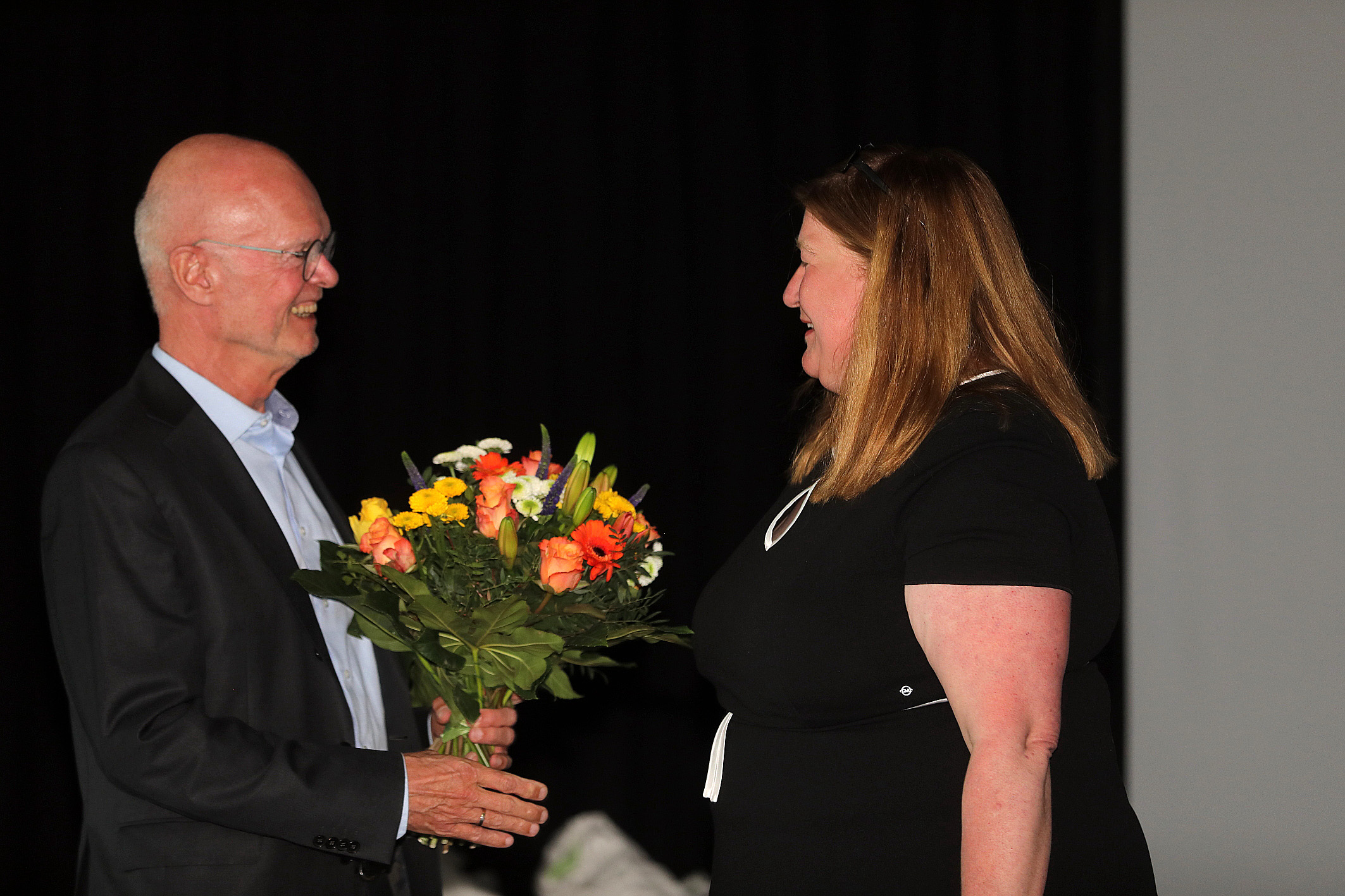 Senatorin Anja Stahmann bedankt sich bei Alexander Künzel für seine großartige Arbeit bei der Bremer Heimstiftung. Foto: Bremer Heimstiftung/Martin Rospek