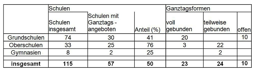 • Zehn offene Ganztagsgrundschulen und zwei gebundene Ganztagsschulen werden eingerichtet, 1112 zusätzliche Ganztagsplätze entstehen allein im Grundschulbereich