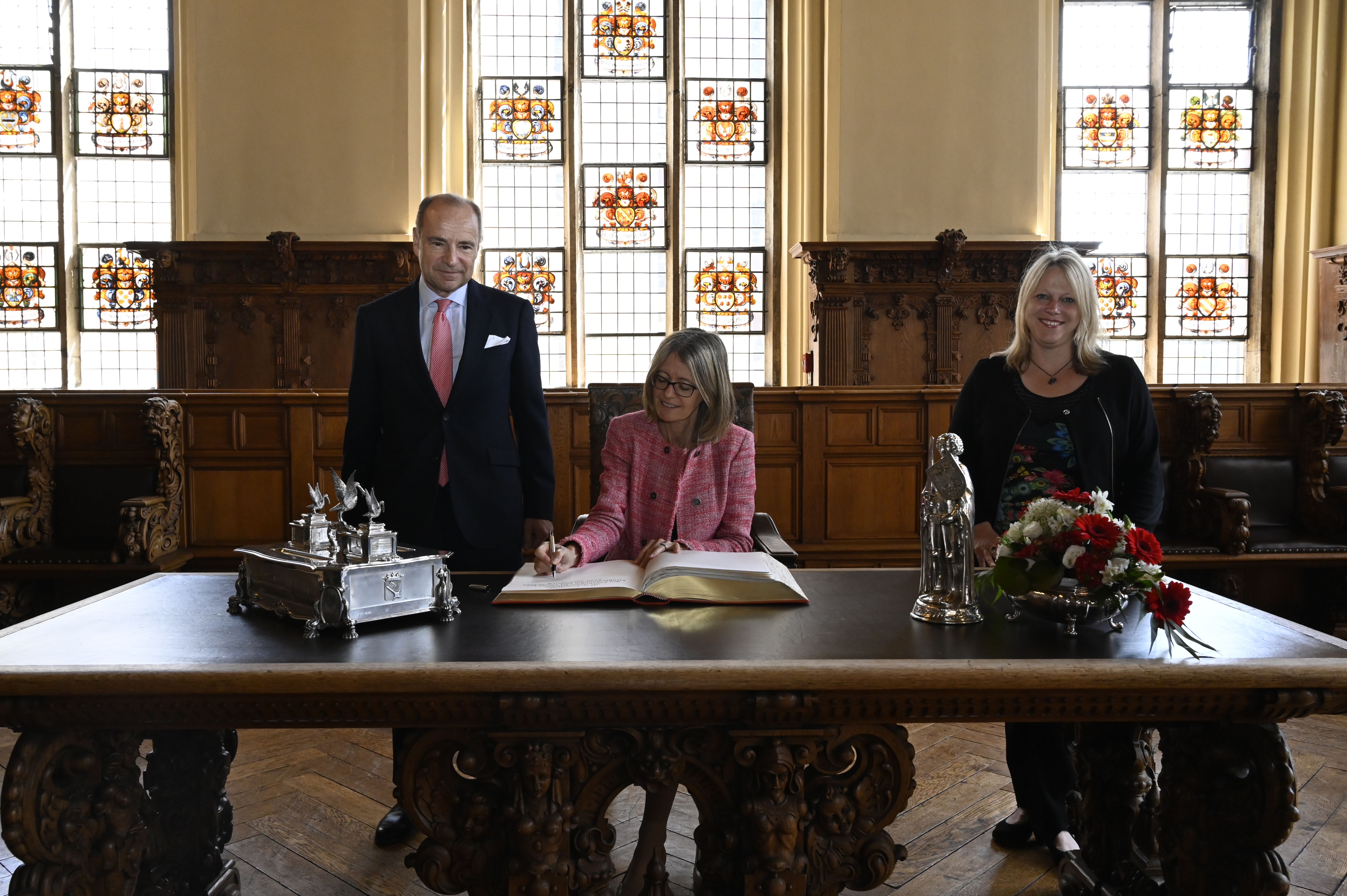 Beim Eintrag in das Goldene Buch (von Links): Generalkonsul Hans-Christoph Enge; Botschafterin des Vereinigten Königreichs Großbritannien und Nordirland, Jill Gallard und Bürgermeisterin Maike Schaefer. Foto: Senatspressestelle