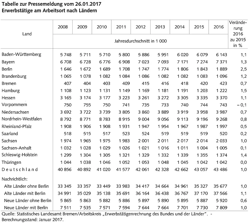 gab es eine solide Zunahme, dort waren 0,3 Prozent mehr Personen erwerbstätig als ein Jahr zuvor. Bundesweit stiegen die Zahlen zur Erwerbstätigkeit insgesamt um 1,0 Prozent.