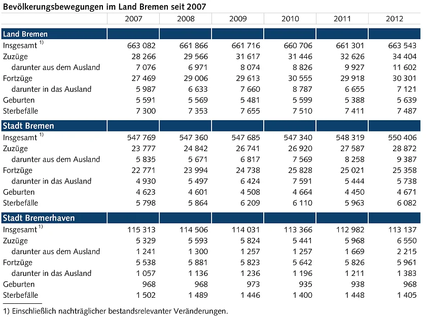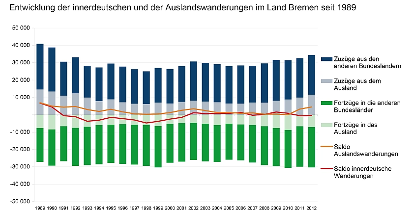 Grund für die Zunahme der Bevölkerung ist der positive Wanderungssaldo von 4 103 Personen in 2012 für das Land Bremen. Im Vergleich zum Vorjahr ist dies ein Anstieg von 51,5 Prozent, zuletzt wurde 2002 ein höherer Wanderungssaldo erreicht. Der positive Saldo resultiert aus den 34 404 Zuzügen und 30 301 Fortzügen. Der größte Teil der Zuzüge stammt dabei aus den anderen Bundesländern (22 802 bzw. 66,3 Prozent). Gegenüber dem Vorjahr bleibt der innerdeutsche Wanderungsaustausch jedoch stabil und damit negativ (-378). Somit basiert das Bevölkerungswachstum ausschließlich auf der Zunahme der Zuzüge aus dem Ausland auf 11 602 (+16,9 Prozent) bei einem nur geringfügig angestiegenen Zuwachs der Fortzüge in das Ausland auf 7 121 (+7,0 Prozent). Insbesondere die Wanderungssalden mit Polen (+910), Bulgarien (+533), Spanien (+449), Italien (+222), Ungarn (+195), Griechenland (+194), Rumänien (+181) und Syrien (+154) tragen die Entwicklung. Damit wandern nicht nur Personen aus den jüngeren EU-Mitgliedsstaaten nach Bremen, sondern vermehrt auch Bürger aus Ländern, die durch die Finanz- und Schuldenkrise stark betroffen sind. Der Wanderungssaldo in Bremerhaven beträgt +589, das ist der höchste Wert nach 2002.