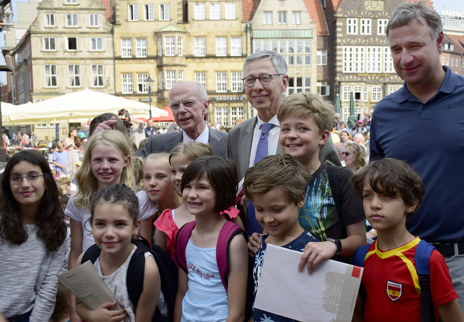 Bildunterschrift: Marco Bode (Aufsichtsratsvorsitzender Werder Bremen), Bürgermeister Carsten Sieling und Bürgerschaftspräsident Christian Weber (v.re.) mit Kindern einer 4. Klassen der Grundschule St. Magnus