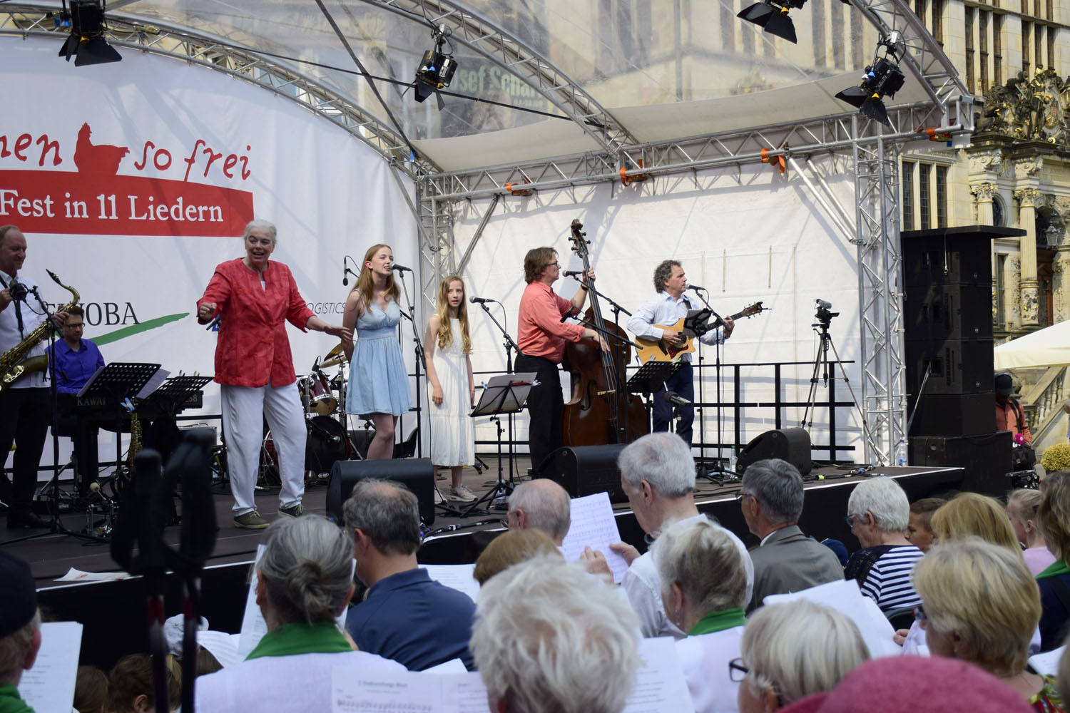 01.06.2018Unter einem leuchtend blauen Sommerhimmel fanden sich am 1. Juni 2018 über 2000 Menschen auf dem Bremer Marktplatz ein, um beim Mitsingfest "Bremen so frei – ein Fest in 11 Liedern" Lieder über das Leben in Bremen und Bremerhaven zu singen. Gekommen waren 30 Schulklassen, eine KiTa-Gruppe, zehn Chöre und unzählige singfreudige Bremen-Fans.