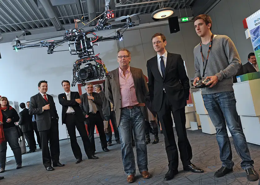 Innovationen bringen Unternehmen nach vorn - erfolgreiche Beispiele gab es am Donnerstag, 16. Februar 2012, auf dem dritten Bremer Innovationstag im Atlantic Hotel Universum zu sehen. Davon ließ sich auch Martin Günthner, Senator für Wirtschaft, Arbeit und Häfen (2. v.r.), anlässlich der offiziellen Eröffnung am Stand des Unternehmens mediaFLIGHT beeindrucken. Das Start-up liefert mittels Flugdrohne Film- und Fotoaufnahmen aus luftiger Höhe. Die Veranstaltung stand in diesem Jahr unter dem Motto " Wirtschaftsförderung live, Innovationen zum Anfassen, Ideen zum Mitnehmen. 14 Bremer Unternehmen präsentierten ihre innovative Produkte und Dienstleistungen in der begleitenden Ausstellung, dazu gab es Vorträge von renommierten Experten und drei Innovationswerkstätten zu den Themen "Ideenquellen 2.0", "War for talents" und das Potenzial der weltweiten Vernetzung.