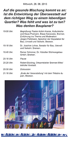Zur öffentlichen Veranstaltung sind herzlich alle interessierten Bürgerinnen und Bürger eingeladen. Moderation: Jürgen Pohlmann, Sprecher der Deputation für Umwelt, Bau und Verkehr. Zum Ende der Veranstaltung tritt "Theatre du Pain" auf.