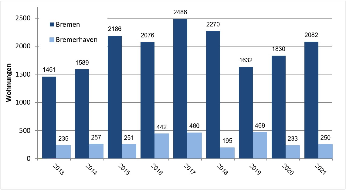 Maike Schaefer, Senatorin für Klimaschutz, Umwelt, Mobilität, Stadtentwicklung und Wohnungsbau, hat heute (8. März 2022) neue Zahlen zur Genehmigung von Bauanträgen vorgestellt. So wurden im Jahr 2021 in Bremen insgesamt 2082 Wohneinheiten genehmigt (einschließlich Baumaßnahmen an bestehenden Gebäuden). Zum Vergleich: Im Vorjahr lag die Zahl der genehmigten Wohneinheiten bei 1830. In Bremerhaven wurden im gleichen Zeitraum im Neubau 266 Wohneinheiten genehmigt. Bedingt durch Rückbaumaßnahmen liegt der bilanzierte Wert dort bei 250 neuen Wohneinheiten.
