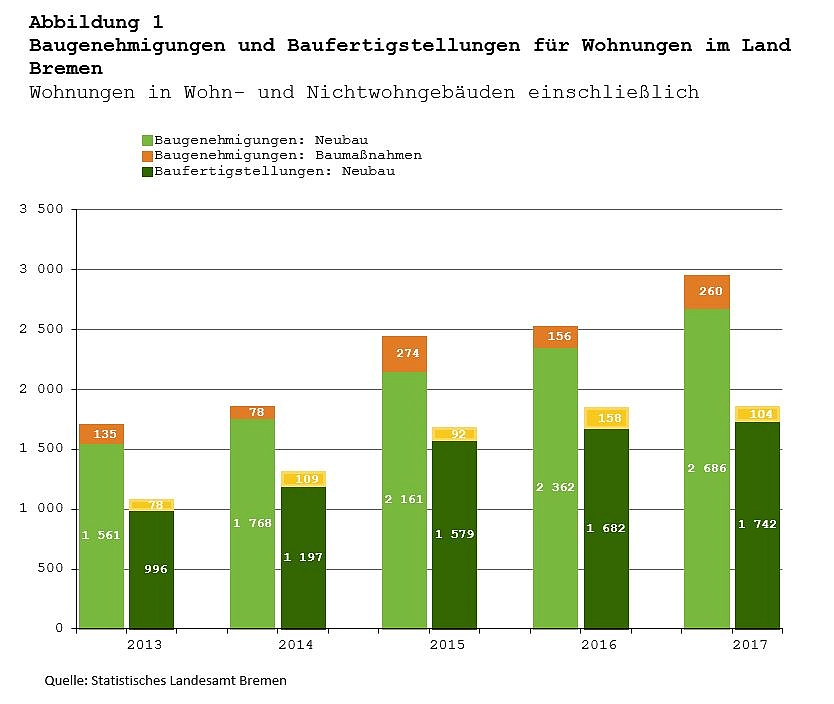 Im Jahr 2017 wurden im Land Bremen Baugenehmigungen für 2 946 Wohnungen erteilt. Insgesamt wurden 1 846 Wohnungen fertiggestellt. Die Zahl der genehmigten Wohnungen stieg in der Stadt Bremen im Vergleich zum Vorjahr um 410 auf 2 486 (+20 Prozent), in der Stadt Bremerhaven stieg sie um 18 auf 460 (+4 Prozent). Die Zahl der Baufertigstellungen lag mit 1 846 im Land Bremen etwa auf dem Vorjahresniveau. Davon wurden 1 629 Wohnungen in der Stadt Bremen und 217 in Bremerhaven errichtet. Der Großteil der Baugenehmigungen und –fertigstellungen bezieht sich auf Gebäude im Neubau; 104 der 1 846 im Jahr 2017 fertiggestellten Wohnungen entstanden durch Baumaßnahmen an bestehenden Gebäuden. Alle Angaben beziehen sich auf Wohnungen im Neubau und auf Baumaßnahmen an bestehenden Gebäuden.
