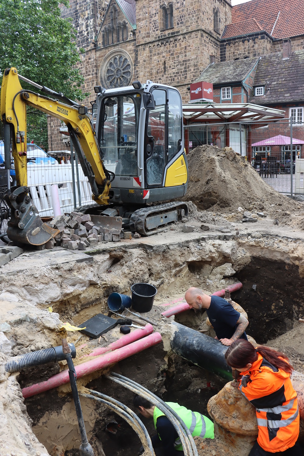 Seit drei Wochen ist Wesernetz mit Arbeiten an der Trinkwasserleitung an der Ecke Obernstraße / Unser Liebfrauen Kirchhof beschäftigt. Ein Schieberkreuz muss erneuert werden. Derzeit blickt man hier in ein circa neun Quadratmeter großes Loch mit einem Wirrwarr aus Rohren, Stromkabeln und Gasleitungen.