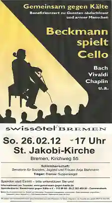 Der bekannte Cellist Thomas Beckmann spielt am kommenden Sonntag, 26. Februar, 17 Uhr, in der Kirche St. Jakobi in der Neustadt Werke von Johann Sebastian Bach, Vivaldi und Charlie Chaplin. Der Musiker engagiert sich seit den 90er Jahren für arme und obdachlose Menschen. Er gründete den Verein „Gemeinsam gegen Kälte“ und gibt viele Benefizkonzerte. In der St. Jakobi-Kirche (Kirchweg 55-57) wird der in Düsseldorf lebende Thomas Beckmann zugunsten der Bremer Suppenengel spielen.