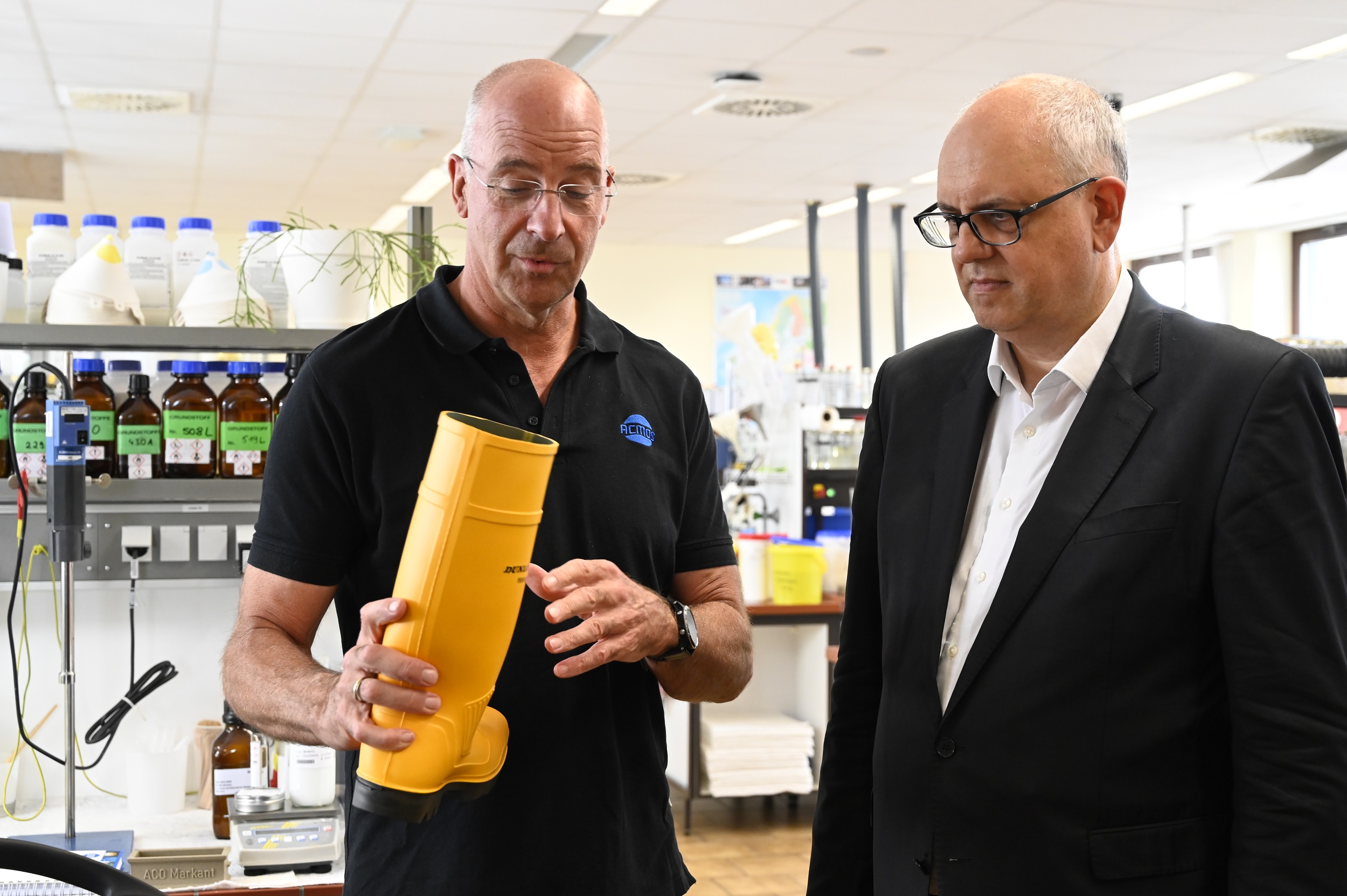 So besuchte der Bürgermeister die ACMOS Chemie KG, eine alteingesessene Bremer Firma, die zu den "hidden champions" zählt. Also zu in ihrer jeweiligen Branche führenden Unternehmen, die am eigenen Firmensitz jedoch kaum bekannt sind und sich eher im Vorborgenen um ihre Geschäfte kümmern. Vor über 100 Jahren gegründet, hat das Familienunternehmen seit 1950 seinen Sitz in der heutigen Airport-Stadt. Über 150 Beschäftigte stellen eine Produktionskapazität von über 10.000 Tonnen jährlich sicher – damit ist ACMOS einer der größten Trennmittelhersteller in Europa. Wichtig dabei: Rund ein Drittel der Belegschaft ist in der Produktentwicklung tätig, wobei auch stark auf Umweltaspekte geachtet wird. So sind mehr als die Hälfte der Produkte wasserbasiert.