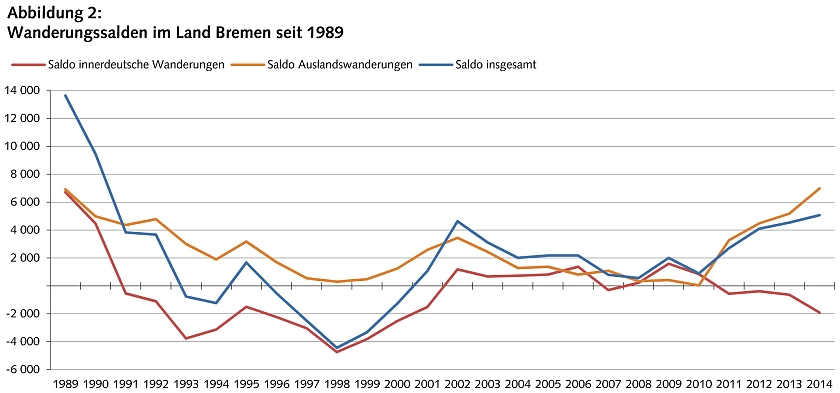 Vor allem gegenüber Niedersachsen (-1471) und den anderen Stadtstaaten (Berlin: -304, Hamburg: -248) hat das Land Bremen Einwohner verloren. Eine positive Wanderungsbilanz bestand 2014 mit Nordrhein-Westfalen (146), Schleswig-Holstein (115), Sachsen-Anhalt (58), Brandenburg (46), Thüringen (37), Mecklenburg-Vorpommern (7) und Rheinland-Pfalz (3).