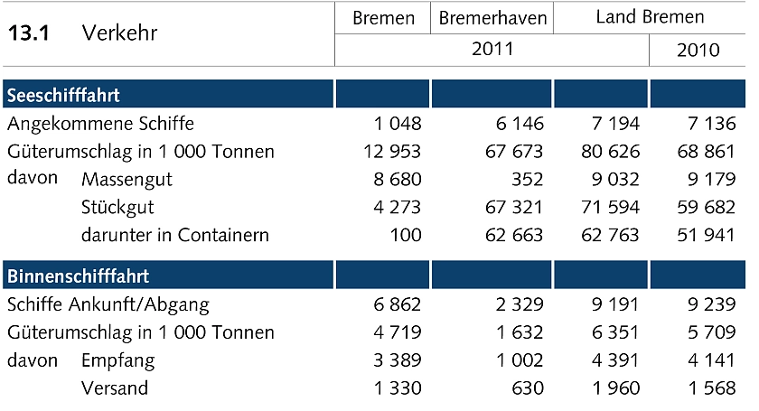 Damit bleibt die Broschüre ein Streifzug durch die Themenvielfalt der amtlichen Statistik und informiert nicht nur über aktuelle Entwicklungen in den Bevölkerungs- und Haushaltsstrukturen oder die Beschäftigungssituation. Die Zahl der angekommenen Gäste und deren Übernachtungen in den bremischen Beherbergungsbetrieben ist ebenso nachzulesen wie der Umschlag am Bremerhavener Seefischmarkt, die Einnahmen und Ausgaben des Landes, die Zahl der Unternehmen im Dienstleistungsbereich und deren Umsätze oder die Entwicklung von Preisen für verschiedene Güter und Dienstleistungen in den letzten Jahren.