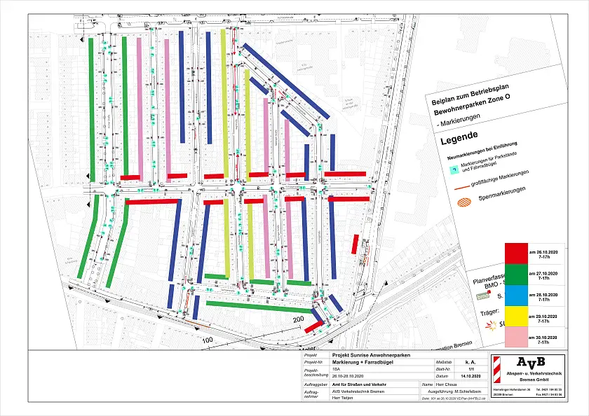 Um das neue Bewohnerparkgebiet in der Östlichen Vorstadt ("SUNRISE-Gebiet") einrichten zu können, werden jetzt die notwendigen Verkehrsschilder und neue Fahrradbügel aufgestellt – zudem müssen Markierungsarbeiten ausgeführt werden. Hierfür dürfen dann in den einzelnen Straßen während der Markierungsarbeiten keine Autos stehen.