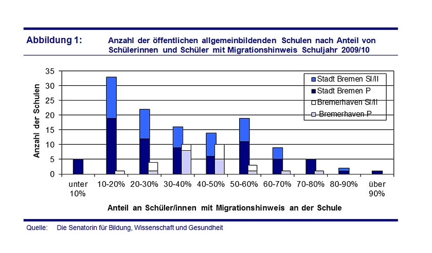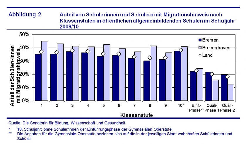 Zugleich sind die Anteile von Kindern und Jugendlichen mit Migrationshintergrund in Bremerhavens Schulen höher als in Bremen. In der Stadtgemeinde Bremen lag der Anteil von Schülerinnen und Schülern mit Migrationshinweis in den unteren Jahrgängen im Schuljahr 2009/10 etwa konstant bei 36 Prozent, er steigt jedoch danach wieder leicht an. In Bremerhaven gilt: Je niedriger die Klassenstufe, desto größer ist hier die Zahl der Migrantinnen und Migranten. In der ersten Klasse lag der Anteil 2009/10 dort bei 45 Prozent.