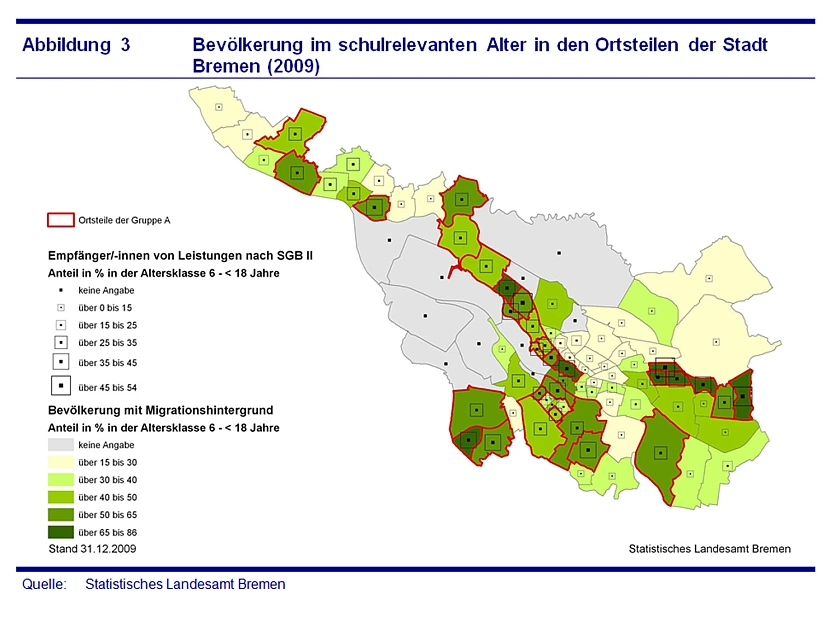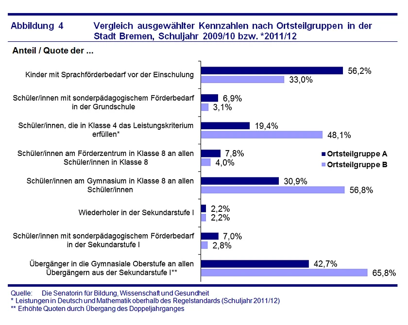 Für die Schülerinnen und Schüler aus unterschiedlichen Ortsteilen der Stadtgemeinde Bremen wurden differenzierte Analysen durchgeführt. Der Befund: Für Schülerinnen und Schüler, die in Ortsteilen der Gruppe A leben, fallen die relevanten Bildungskennzahlen im Durchschnitt durchweg ungünstiger aus als für Schülerinnen und Schüler aus den Ortsteilen der Gruppe B. Außerdem unterscheiden sich die Schulen in der Stadt Bremen nicht nur bezüglich der ethnisch-kulturellen Zusammensetzung der Schülerschaft voneinander, sondern auch bezüglich des sozialen Gefüges.