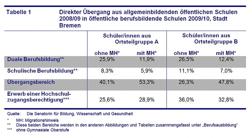 In der beruflichen Bildung sind die Ausbildungsleistung im Land Bremen und der Anteil von Personen, die in Bremen eine Berufsausbildung beginnen, im bundesweiten Vergleich hoch. Schülerinnen und Schüler mit Wohnsitz im Land Bremen beginnen jedoch seltener eine Ausbildung und besonders häufig eine Maßnahme im Übergangsbereich. Dies gilt insbesondere für Migrantinnen und Migranten und für Schülerinnen und Schüler mit einem Wohnsitz in der Ortsteilgruppe A: Schülerinnen und Schülern mit Migrationshinweis gelang bei vermuteter ähnlicher sozialer Lage – also aus den gleichen Ortsteilgruppen – ein direkter Übergang in eine Berufsausbildung nur etwa halb so oft wie den Schülerinnen und Schülern ohne Migrationshinweis. Dafür gingen sie nach Verlassen der allgemeinbildenden Schulen deutlich häufiger in den Übergangsbereich über. Über 50 Prozent der direkten Übergängerinnen und Übergänger mit Migrationshinweis in beruflichsbildende Schulen, die in einem Ortsteil der Gruppe A leben, gingen in den Übergangsbereich, fast nur jedem zehnten dieser Jugendlichen gelang der Übergang in die duale Ausbildung.