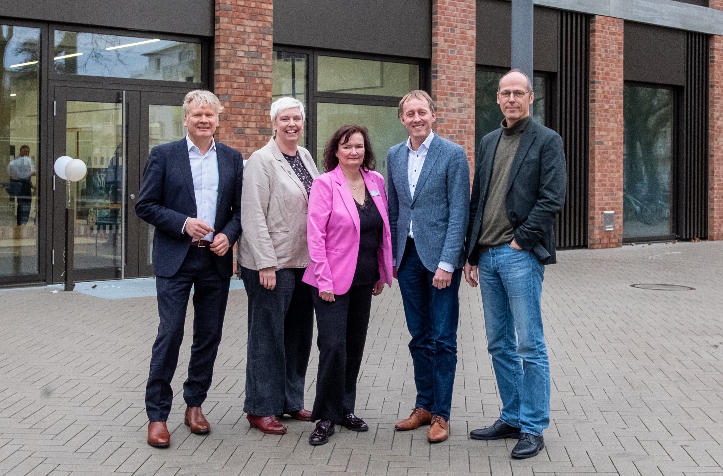 Trafen sich bei der Eröffnungsfeier der Neuen Oberschule Lehe (NOL): Stäwog-Chef Sieghard Lückehe (von links), Schulamtsleiterin Swantje Hüsken, Schulleiterin Christine Fiebig, Schuldezernent Hauke Hilz und der Senator für Kinder und Bildung, Mark Rackles.