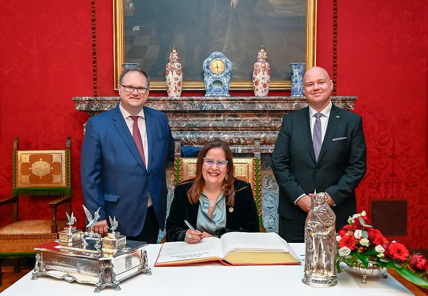 Die Botschafterin der Republik Kolumbien, Yadir Salazar Mejia, ist heute (8. November 2024) von Bürgermeister Björn Fecker zum Antrittsbesuch im Rathaus begrüßt worden. Er vertrat dabei den Präsidenten des Senats, Bürgermeister Andreas Bovenschulte. Begleitet wurde die Diplomatin von Felix Merkel, dem neuen Honorarkonsul für Kolumbien. Bürgermeister Fecker überreichte ihm heute seine Ernennungsurkunde. Nach dem Eintrag der Botschafterin in das Goldene Buch der Freien Hansestadt Bremen folgte ein Gespräch im Senatssaal.