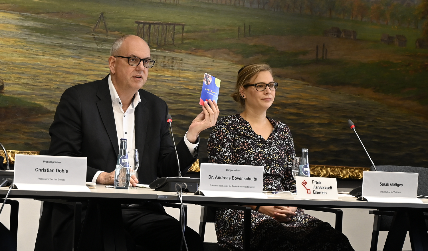 Bürgermeister Andreas Bovenschulte präsentiert zusammen mit der Projektreferentin Sarah Göttges die FreiKarte. Foto: Senatspressestelle