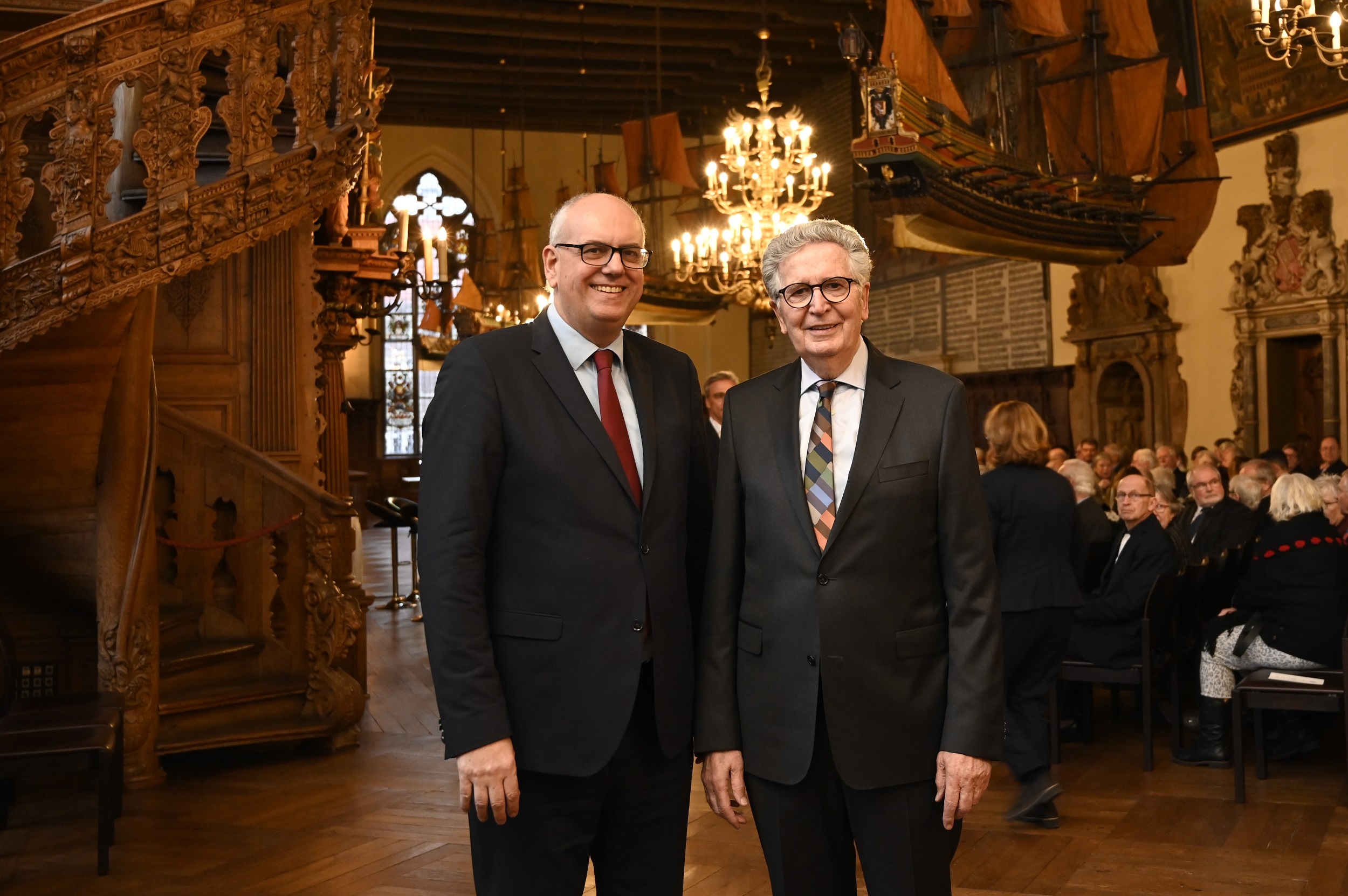 12.01.2024Zum 80. Geburtstag von Bremens ehemaligem Bürgermeister Klaus Wedemeier hat Bürgermeister Andreas Bovenschulte heute (12. Januar 2024) zu einem Symposium in die Obere Rathaushalle eingeladen. Zum Thema "EU-Politik im Spannungsfeld zwischen Idealen und Realitäten" diskutierten nach einer Keynote von Prof. Dr. Arndt Wonka, Direktor am Institut für Europastudien an der Universität Bremen, Bovenschulte und Wonka anschließend mit der Rektorin der Universität Bremen, Prof. Dr. Jutta Günther, und der Studentin Paula Lozano Everszumrode (Bachelorstudiengang Integrierte Europastudien). Sie gingen unter anderem der Frage der Bedeutung eines europäischen Hochschulraums ebenso nach wie der nach dem Umgang mit den aktuellen Herausforderungen der EU. Kai Niklasch, Leiter des ZDF-Studios Bremen, moderierte die Veranstaltung.