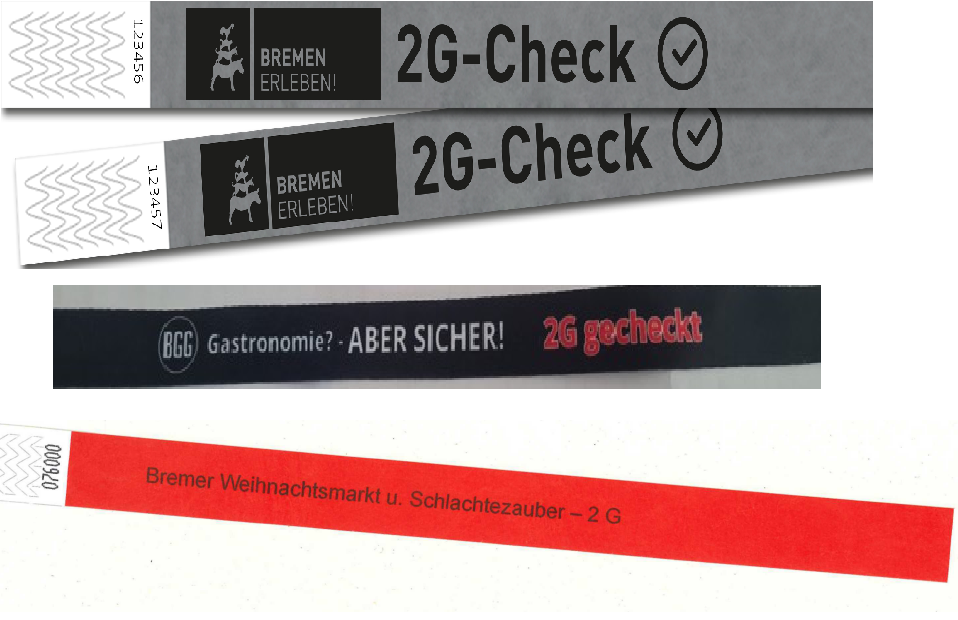 Um das Kontrollverfahren für Geschäfte, Einrichtungen und Kundinnen und Kunden zu vereinfachen und mehrfache Prüfungen zu vermeiden, wird die Bänderregelung, die bereits auf dem Weihnachtsmarkt und dem Schlachtezauber praktiziert wird und sich bewährt hat, ab sofort eingesetzt. Nun werden neben dem Band "Weihnachtsmarkt und Schlachtezauber" auch die Bänder der Bremer Gastro Gemeinschaft e.V. "BGG Gastronomie? - ABER SICHER! 2GCheck" und ab der kommenden Woche das Bremen-Band "Bremen erleben – 2G-Check" zum Einsatz kommen. Insgesamt sind im ersten Schritt über eine Million Bänder bestellt, die Auslieferung erfolgt bereits.