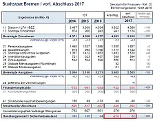 „Bremen bleibt auf Konsolidierungskurs“, erklärt Finanzsenatorin Karoline Linnert mit Blick auf den vorläufigen Jahresabschlusses 2017. Bremen hat auch im vergangenen Jahr die Vorgaben für den Erhalt der 300 Millionen Euro Konsolidierungshilfe erfüllt – zum siebten Mal in Folge. „Unsere strikte Haushaltsdisziplin und günstige Rahmenbedingungen haben zu diesem positiven Ergebnis geführt. Auch die sinkenden Flüchtlingszahlen und eine höhere Beteiligung des Bundes an den Kosten der Aufnahme und Integration haben ihren Teil dazu beigetragen.“