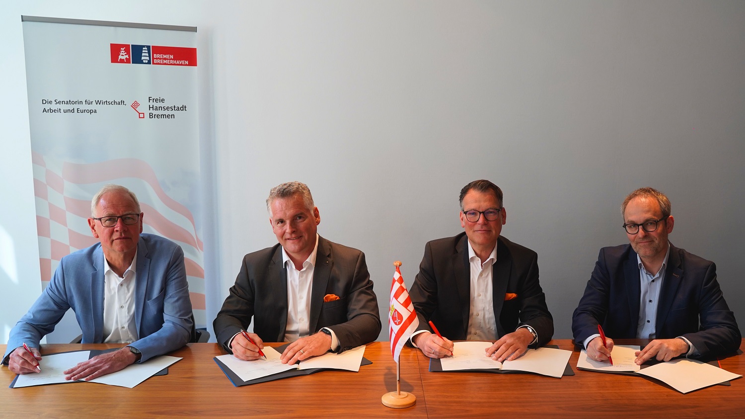 Unterzeichnung Kooperationsvereinbarung zum Ausbau des Glaserfasernetzes in Bremen-Nord (v.l.n.r.): Sven Wiebe, Staatsrat bei der Senatorin für Wirtschaft, Arbeit und Europa, Soeren Wendler, Geschäftsführer Marketing & Vertrieb bei der Deutsche GigaNetz, Norbert Peters, Regionalleiter Nord Deutsche GigaNetz, Enno Eike Nottelmann, Staatsrat bei der Senatorin für Klimaschutz, Umwelt, Mobilität, Stadtentwicklung und Wohnungsbau. Foto:SWAE