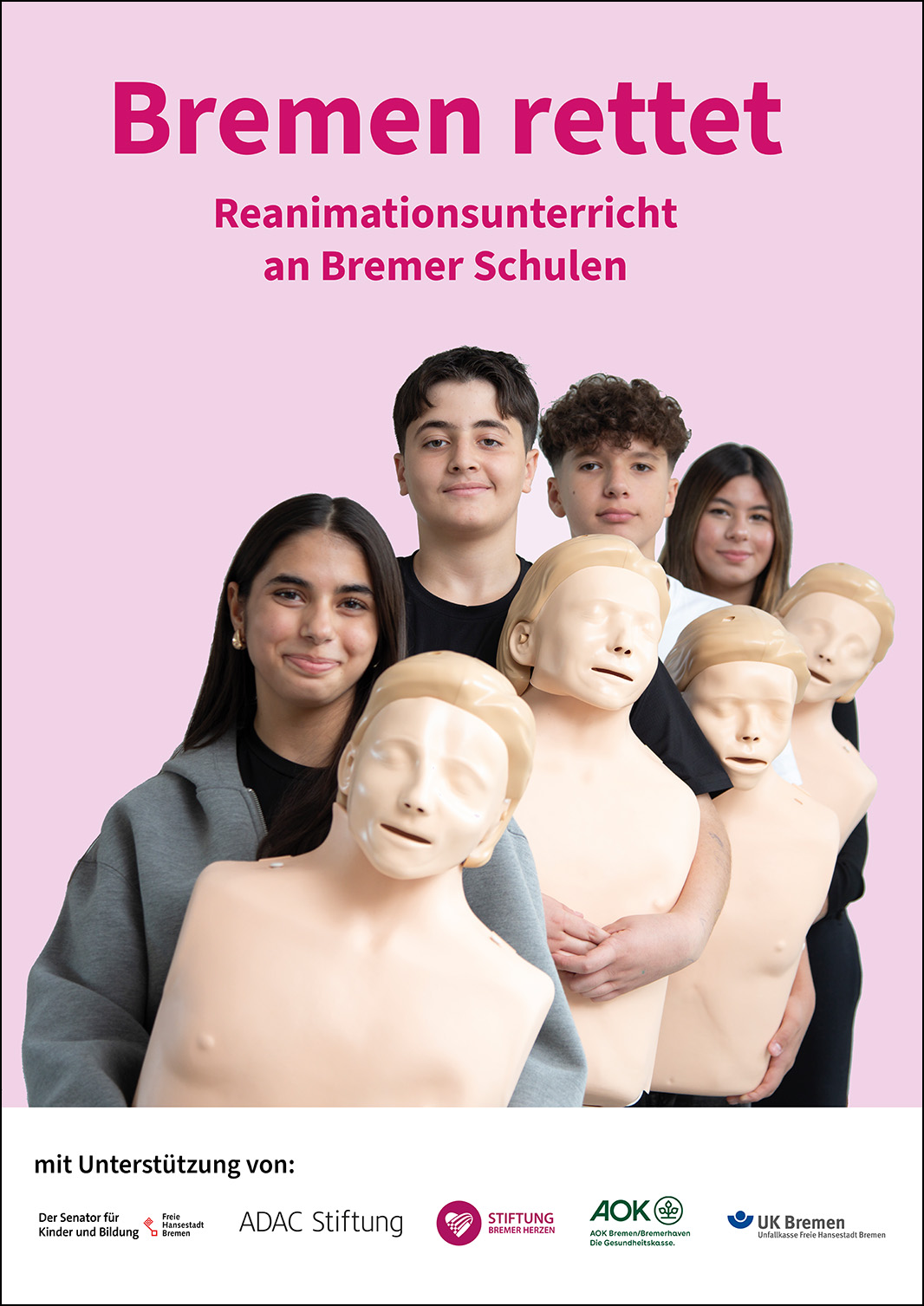 Unter dem Motto "Bremen rettet" lernen Schülerinnen und Schüler in Bremen und Bremerhaven, wie sie im Notfall richtig handeln. Am Montag und Dienstag (3. November und 4. November) werden die ersten Lehrkräfte bei der "Stiftung Bremer Herzen" geschult. Das Projekt des Senators für Kinder und Bildung in Zusammenarbeit mit der ADAC Stiftung, der "Stiftung Bremer Herzen", der AOK Bremen/Bremerhaven und der Unfallkasse Freie Hansestadt Bremen vermittelt ab Klasse 7 praxisnahes Reanimationstraining.