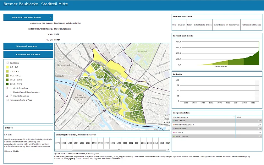 Die "Bremer Baublöcke" sind ein interaktives Informationsangebot des Statistischen Landesamtes Bremen, mit dem statistische Kennzahlen der über 5.000 Baublöcke der Stadt Bremen abgebildet werden. Nicht nur die Datenbasis wurde jetzt aktualisiert. Durch den Einsatz einer neuen Programmversion konnten das Layout überarbeitet und neue Funktionen eingefügt werden. Die "Bremer Baublöcke" wurden dadurch übersichtlicher und flexibler in der Handhabung.