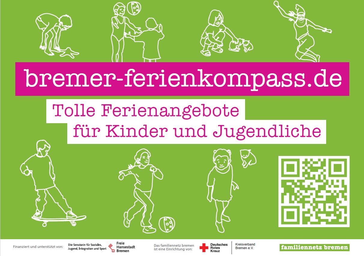 Eltern erhalten mit dem Bremer Ferienkompass einen guten Überblick zu Ferienangeboten in Bremen und Umgebung. Auf bremer-ferienkompass.de bündelt das familiennetz bremen im Auftrag der Senatorin für Soziales, Jugend, Integration und Sport zahlreiche Veranstaltungen, Kurse und Programme, bei denen Schulkinder ab sechs Jahren verlässlich betreut werden.
