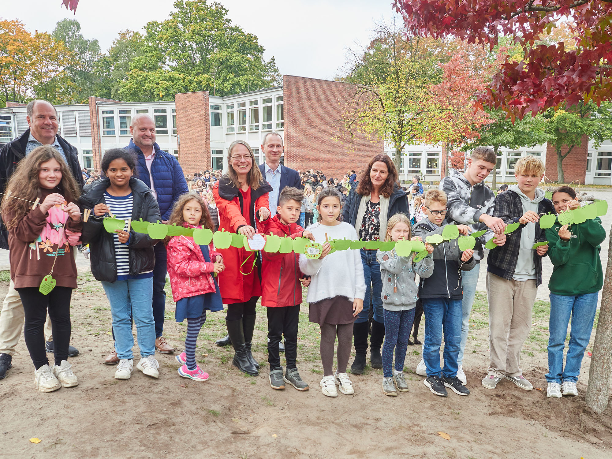 Zur symbolträchtigen Uhrzeit "fünf vor Zwölf" startete der Auftakt des Projektes "Schulen auf dem Weg zur Klimaneutralität" auf dem Schulcampus der Wilhelm-Focke-Oberschule und der benachbarten Marie-Curie-Grundschule. Gemeinsam mit der Schule am Baumschulenweg wollen die Institutionen einen schuleigenen umfassenden Klimaschutzplan entwickeln, der weit über die rein pädagogische Aufbereitung von Klimaschutzthemen hinausgeht und die Handlungsfelder Energie, Wasser, Mobilität, Verpflegung und Beschaffung umfasst. "Toll, dass sich so viele Menschen in unseren Schulen für Klimaschutz und Nachhaltigkeit einsetzen. Sowohl die Kleinsten in der 1. Klasse als auch die Eltern und die Kolleginnen und Kollegen an den Schulen machen mit", sagt Sascha Karolin Aulepp, Senatorin für Kinder und Bildung. "Ich bin stolz, dass an den Schulen mit dem Projekt von energiekonsens Klimaschutzpläne von allen gemeinsam entwickelt werden. Das ist klimaschützende Selbstwirksamkeit im Wortsinne."