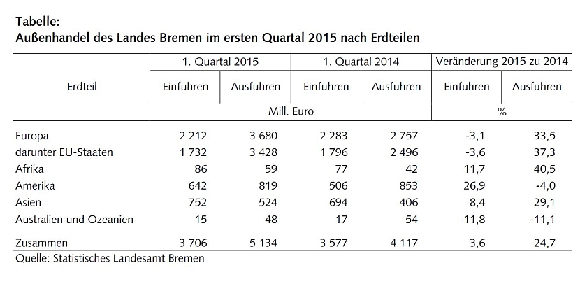 Das Statistische Landesamt Bremen teilt mit: Der bremische Außenhandel ist im ersten Vierteljahr 2015 gegenüber dem ersten Vierteljahr 2014 erheblich angestiegen. Während die Importe der bremischen Firmen und Händler um 3,6 Prozent auf zusammen knapp 3,7 Milliarden Euro stiegen, erhöhten sich die Exporte im gleichen Zeitraum um fast ein Viertel auf mehr als 5,1 Milliarden Euro. Wichtigste Importländer waren die Staaten der Europäischen Union. Deren Aufkommen belief sich zusammen auf mehr als 1,7 Milliarden Euro und erreichte damit einen Anteil von 50,2 Prozent. Im Vergleich mit dem ersten Quartal 2014 ergab sich hier für 2015 ein Rückgang um 3,6 Prozent. Bei den übrigen europäischen Staaten betrug der Rückgang 1,4 Prozent auf knapp 0,5 Milliarden Euro.