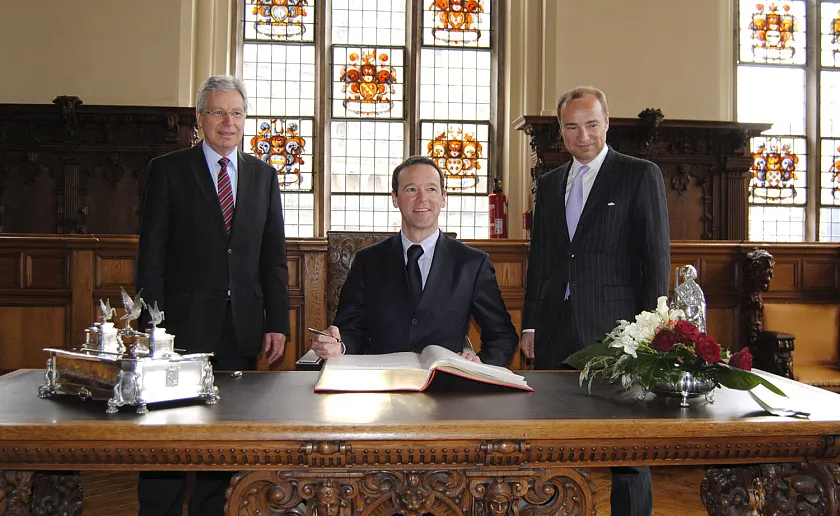 Simon McDonald (Mitte) hat sich als neuer Botschafter Großbritanniens in das Goldene Buch Bremens eingetragen. McDonald ist seit Oktober 2010 in Deutschland akkreditiert und hat heute (05.04.2011) seinen Antrittsbesuch im Land Bremen absolviert. Dazu wurde er am Mittag von dem Präsidenten des Senats der Freien Hansestadt Bremen, Bürgermeister Jens Böhrnsen, im Rathaus empfangen. Im anschließenden Gespräch ging es unter anderem um die derzeitige Debatte in Deutschland über den weiteren Umgang mit der Kernenergie sowie um die Auswirkungen der Krise in Japan.