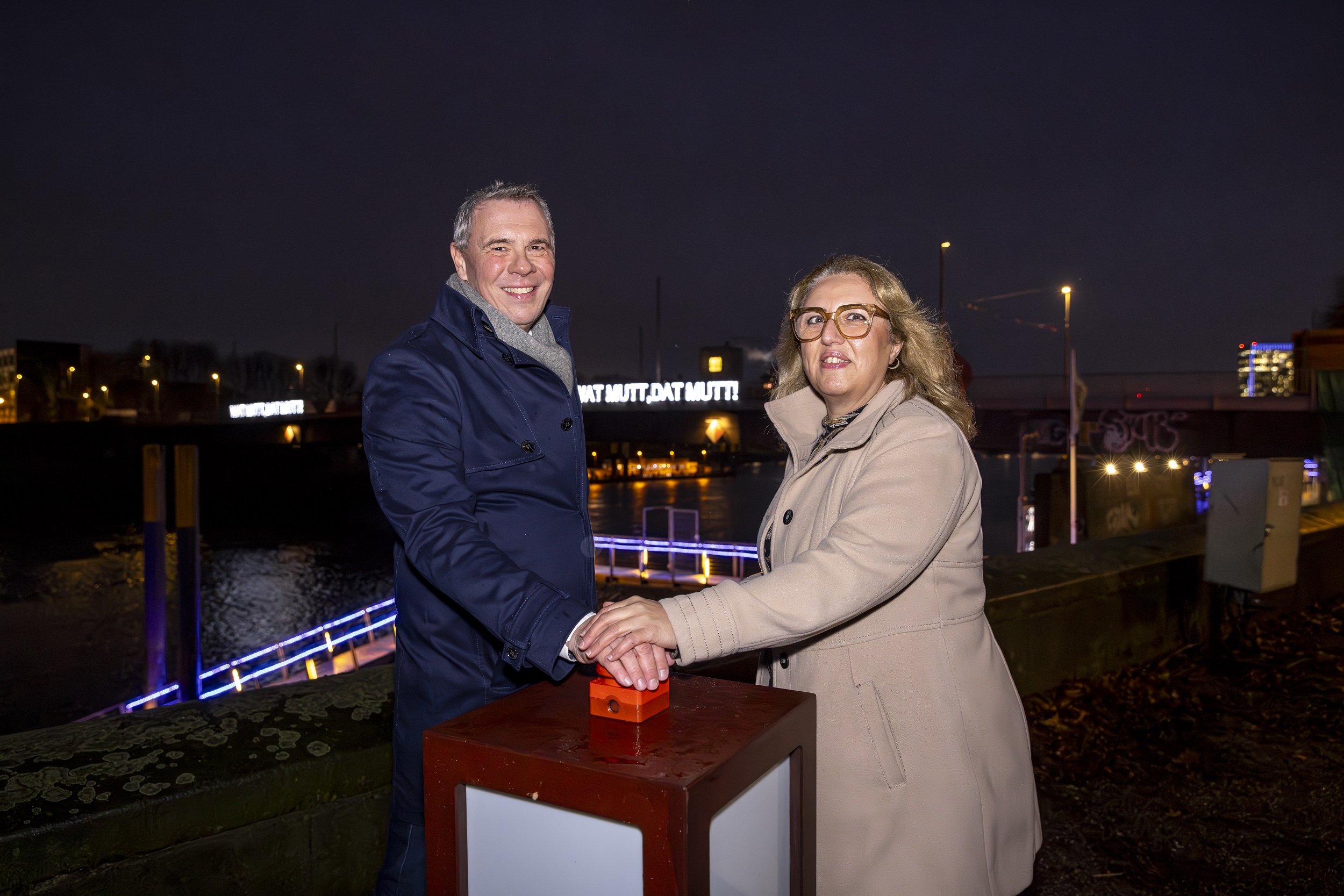 Bausenatorin Özlem Ünsal und Jens Ristedt von der City-Initiative schalteten das Licht an. Foto: GfG / Gruppe für Gestaltung, Michel Iffländer