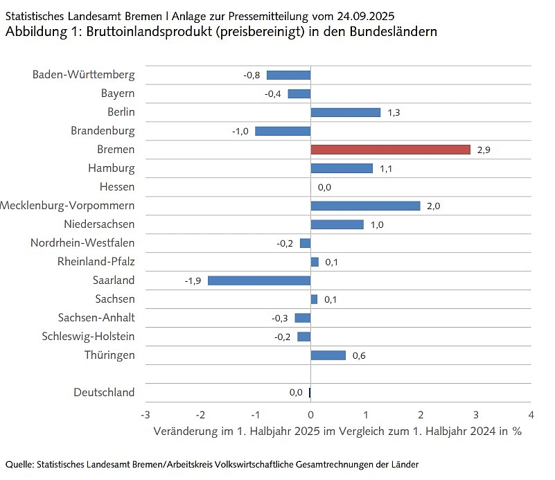 24.09.2025Die Wirtschaftsleistung im Land Bremen ist nach ersten vorläufigen Berechnungen des Arbeitskreises "Volkswirtschaftliche Gesamtrechnungen der Länder", dem das Statistische Landesamt Bremen als Mitglied angehört, im ersten Halbjahr 2025 angestiegen. Das Bruttoinlandsprodukt liegt preisbereinigt um 2,9 Prozent über dem Vorjahreszeitraum. Im Bund bleibt das Bruttoinlandsprodukt preisbereinigt unverändert.